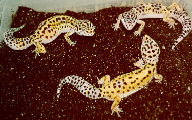 Leopard Geckos reach a size of 8 to 10 inches. Most adults are yellow with dark brown spots. Juveniles are generally are banded yellow and dark brown which fades into the spotted pattern as the gecko matures.The males seems to have a broader head and neck than the female and the bodies are somewhat larger. However, looking at the undersides, adult males have a prominent V-shaped row of pre-anal pores while the pre-anal pores of the female are barely noticeable. Adult males also have hemipenile swellings and a wider tail base. The sex of the leopard gecko seems to be determined by the temperature at incubation. Eggs incubated between 79-83 are generally female, 84-86 are about half of each sex, and above 87 are usually male.