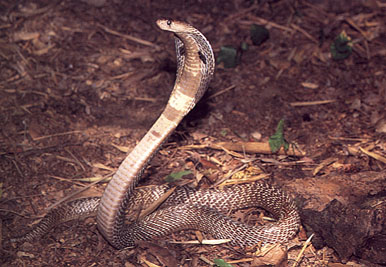 Two subspecies of cobras are found in Pakistan, the Indian or spectacled cobra (naja naja naja) and the Central Asian or Oxus cobra (naja naja oxiana). Both these subspecies of cobra are about the same size. Average length is 1.9 meters, with a maximum length of 2.4 meters. N.n.naja has a spectacled marking on back of the neck (also visible from front on rare specimens). The hood appearance varies greatly. The body coloration is yellow to dark brown and black for both sexes. Males are generally heavier, shorter than females, but tails longer. N. oxiana is similar in appearence, but lacks the spectacle marking as in N.n.naja. This cobra is diurnal; mostly active during evening and early morning. It may enter human dwellings when hunting. Normaly, it is not considered aggressive and will avoid confrontation with humans. But, when threatened or cornered, will lift upper body, and will spread its hood. When bitting, it hold on and chews savagely. May strike repeatedly. This snake can be exceptionally quick-moving and agile. The fangs and venom glads of both sub-species are large. The venom is highly toxic. Snake bite symptoms begin approximately 8 minutes after bite. Victims experiences anxiety, the pulse quickens, grows weak and irregular. The victim soon falls into deep coma.Habitat and Distribution: