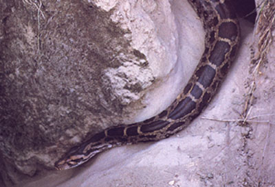 The Indian python is one of the world's largest snakes, sometimes reaching lengths of more than 20 feet. Pythons prey on birds and other reptiles, but they prefer small mammals, such as rats. In many parts of their remaining natural range, pythons keep rodent populations in check -- a valuable ecological role that is generally unappreciated by local human inhabitants. Pythons -- like snakes everywhere -- tend to be regarded as dangerous and are often killed on sight. The Indian Python does not wriggle like other snakes, but moves by wave-like movements of its ribs. It is not poisonous and kills its prey by constriction with its body coils, before swallowing its victim head first. It is an good swimmer as well.Habitat and Distribution: