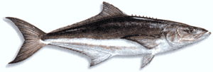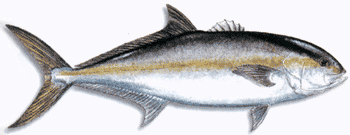 Description: Overall brownish or goldish. Heavy body. No scutes forward of tail fin. Dark oblique line through the eye that ends at the dorsal fin.Size: Schools of young fish are common at 5-20 pounds. Average size over deep wrecks and reefs is 30-60 pounds, but 100-pounders are not too rare and the potential maximum exceeds 150 pounds. World record 155 pounds (all above information from BigFishTackle.com) .