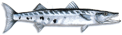 Description: Greenish or grayish above, with silvery sides marked by numerous dark blotches. Tall widely forked with pointed lobes. Two other members of the cuda family might be encountered. The fairly uncommon Southern Sennet, Sphyraena picudilla, grows to about 18 inches, but looks very similar to the bigger Cuda and is usually found in schools. The Guaguanche, Sphyraena guachancho, is much like the Sennet in size, shape and rarity. It can be distinguished by a yellow or gold mid-body stripe.Size: The Great Barracuda ranges from foot-long juveniles on shallow flats to 50 pounds or more offshore. Usual maximum is around 30 pounds, with the average being 5-15 pounds. World record 85 pounds (all above information from BigFishTackle.com).