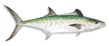 Description: Dark above with silvery sides. Many spots, which are both yellow and brown. The body is proportionately deeper than with juvenile King Mackerel, and the yellow spots appear rounder and brighter, but if in doubt, the only true identifier is the lateral line, which tapers rather gently from front to back with no severe dip.Size: Common at 1-3 pounds; not too unusual at 5-7 pounds; maximum potential over 10 pounds. World record 13 pounds (all above information from BigFishTackle.com).