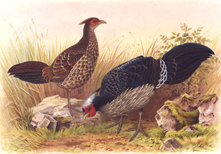 black, their greyish rather than reddish legs, and a thinner occipital crest. Females cannot be safely distinguished from silver pheasants in the field. The males have harsh crowing calls that are uttered during the breeding season, a drumming sound that is produced by wing-whirring, and the species' alarm call is a repeated whoop-keet-keet. The birds are generally associated with tropical to temperate forests under 6000 ft, but sometimes occur up to 10 000 ft in the Himalayas.