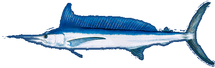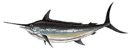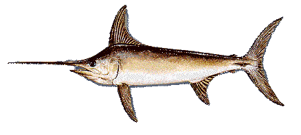 Description: A chunky and powerfully built fish with a high, crescent-shaped dorsal fin and broadly forked tail. The pectoral fins are also large and lunate. The distinguishing feature, however, is the huge bill or sword - much longer and wider than the bills of Marlins and Sailfish. The eye is also very large. Color is mostly dark brown to purple, with whitish undersides.Size: Historically, from 100 to more than 1,000 pounds; however, relentless and virtually unregulated commercial longline fishing has lowered the average to well under 50 pounds