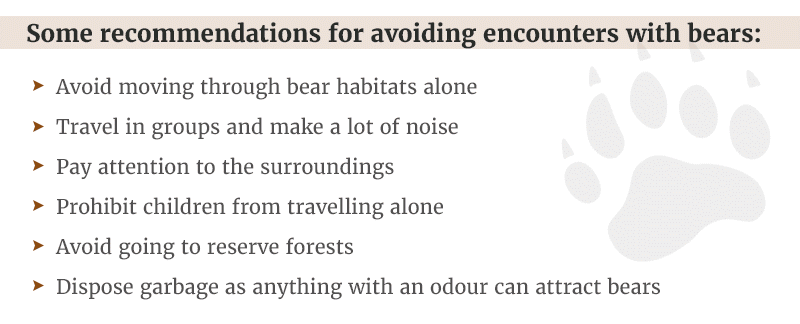 When bears don't find food in their natural habitat, they seek out human food sources. Hence, it is crucial that activities in reserve forests be banned. To ensure this, the government should increase the number of wildlife watchers.