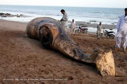 September 2009. A 45 feet long sub adult Fin whale (Balaenoptera physalus) washed up on the beach of East bay in Gwader, Pakistan. The whale appeared to have some injuries on the fluke and on its head and the cause of mortality was concluded to be due to accidental capture in gill nets.
